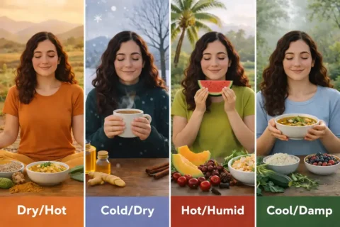 This is why ritucharya exists: not to “follow a seasonal menu,” but to respond intelligently to predictable doshic tendencies created by seasonal qualities—especially during transitions (ritu-sandhi).